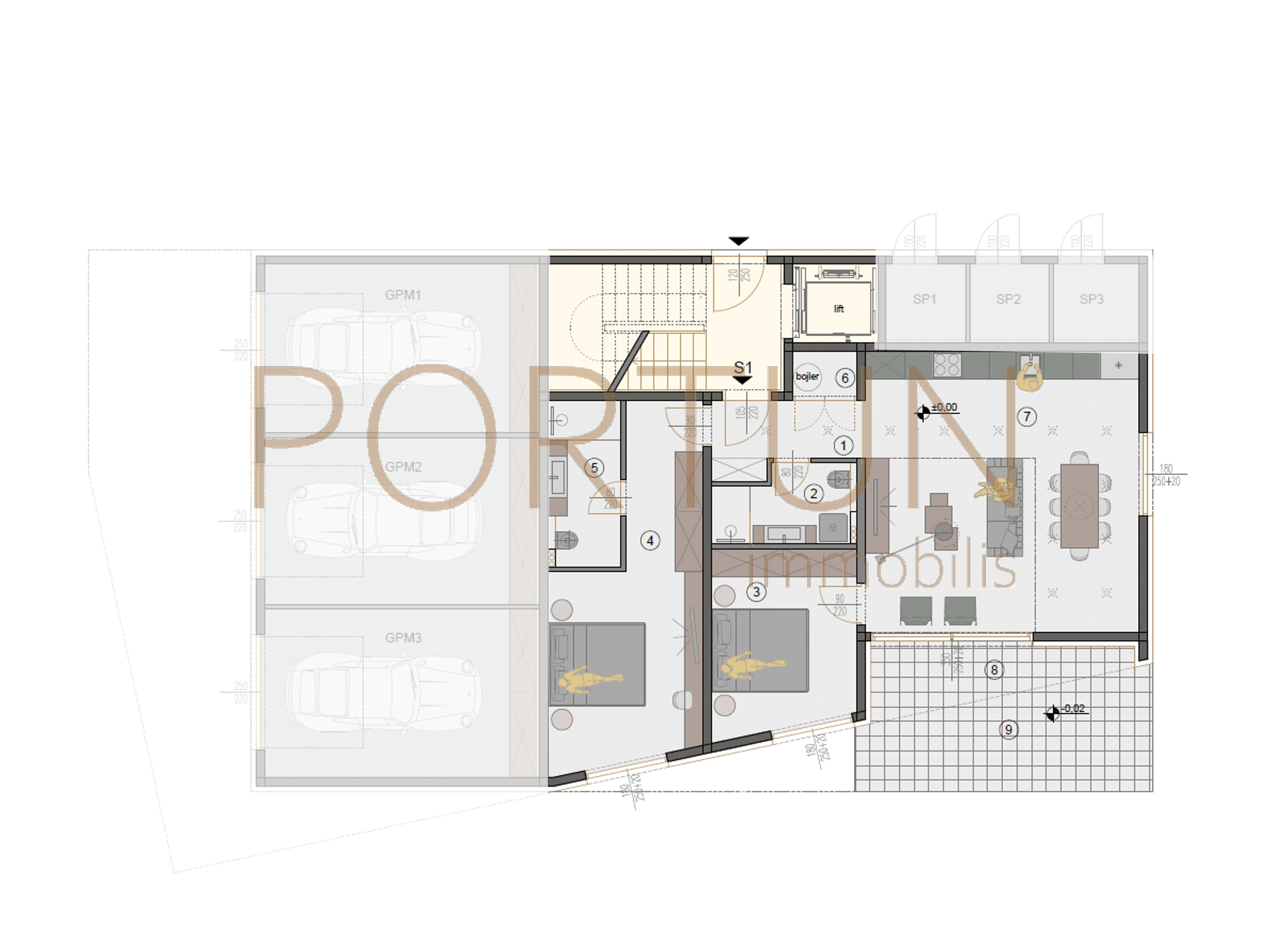 2 ▪ Südostausrichtung ▪ Ausgang zur überdachten Terrasse ▪ Geräumiges Wohnzimmer ▪ Große Glaswände im Wohnzimmer ▪ Eine hervorragende Orientierung sorgt für viel natürliches Licht ▪ Küche in einer Linie ▪ Tisch ▪ 8 Stühle