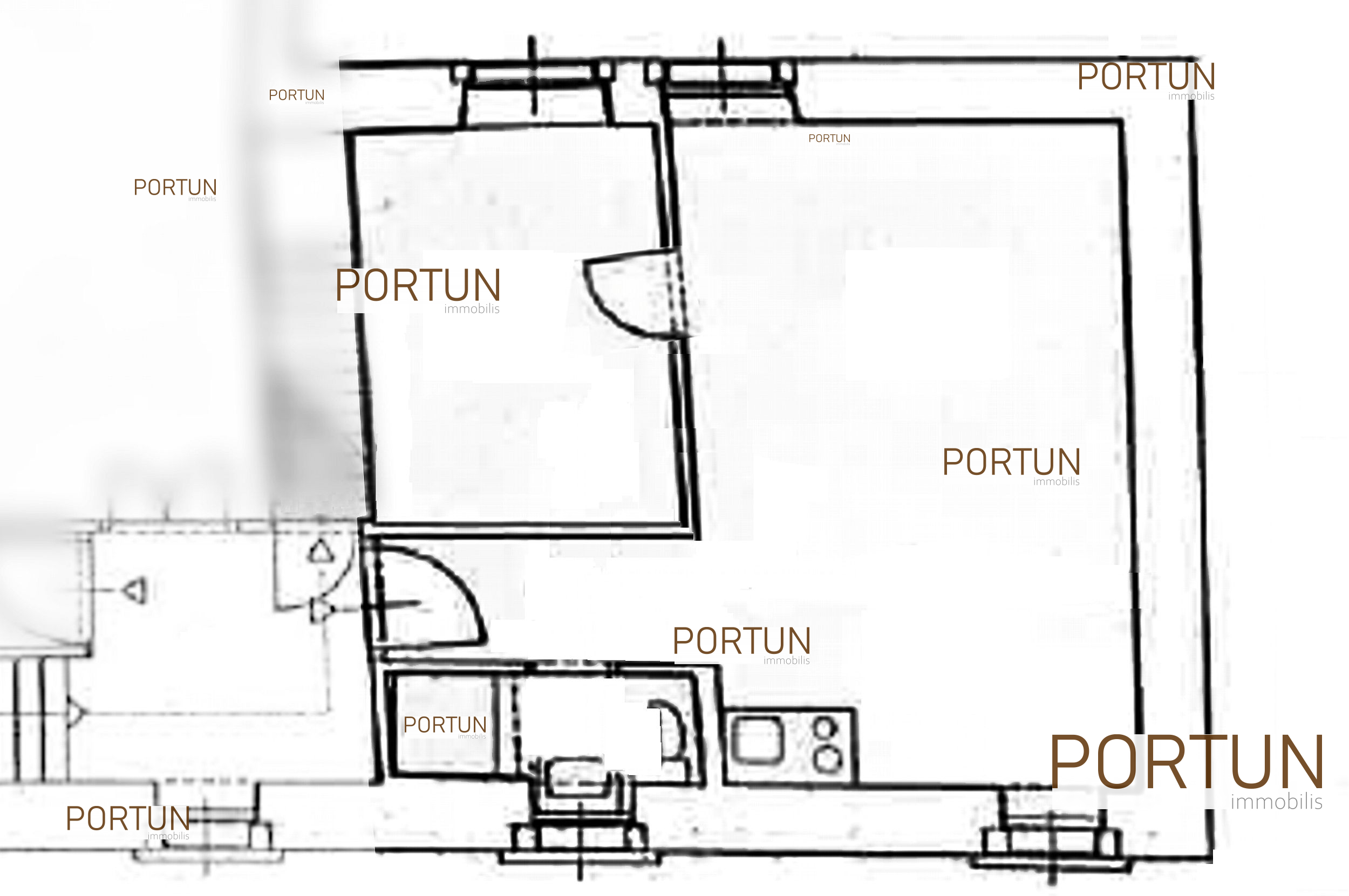 Internal turning stairs lead to the entrance to the apartment on the 3rd floor. The airy apartment, with approx. 31 square meters includes a living room with a kitchen and a dining room, one bedroom, one bathroom and one hallway.