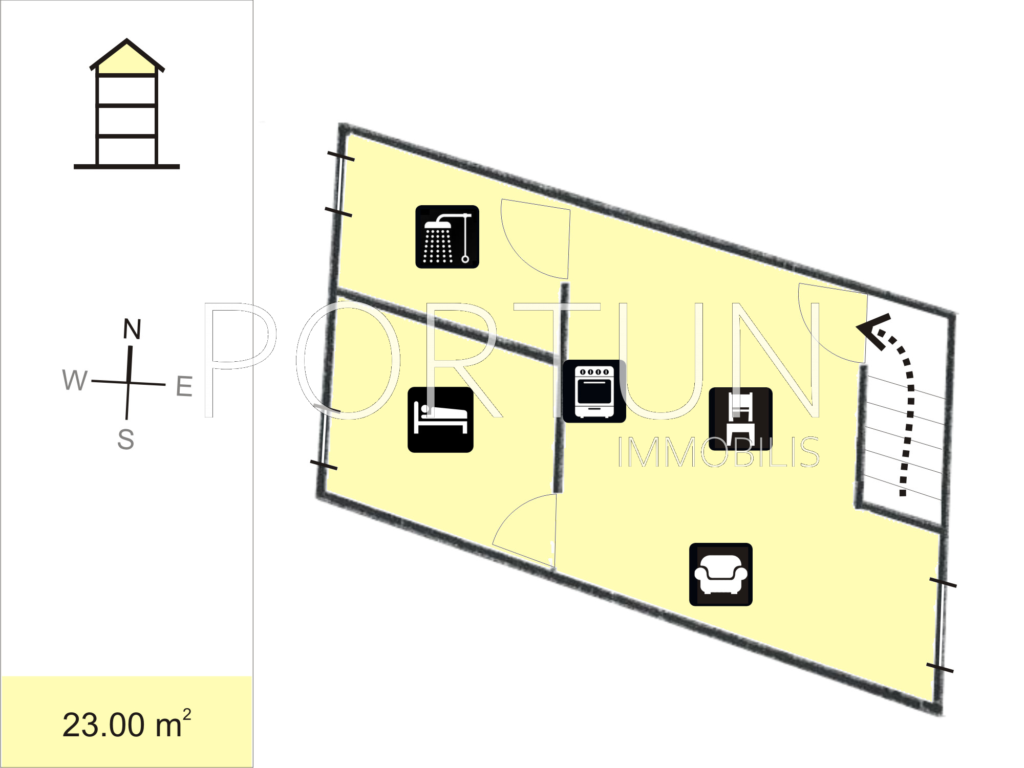 Freshly decorated apartment in the center of Rovinj, is a pleasant summer oasis for two guests looking to explore the charms of the old town. The interior, executed in a combination of white surfaces and wooden elements, is harmoniously complemented by various decorations and original lighting inspired by the fishing tradition of Rovinj. The flat measures approx. 23 sqm. The flat offers sea view from the living room window.