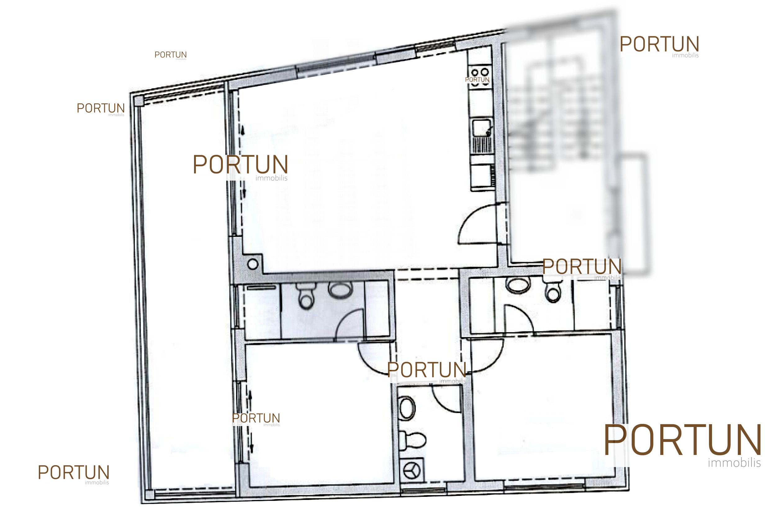 Internal turning stairs lead to the entrance to the apartment on the 1st floor. The airy apartment, with 85 square meters includes a living room with a kitchen and a dining room, two bedrooms with bathrooms, a covered terrace, one bathroom and one hallway.