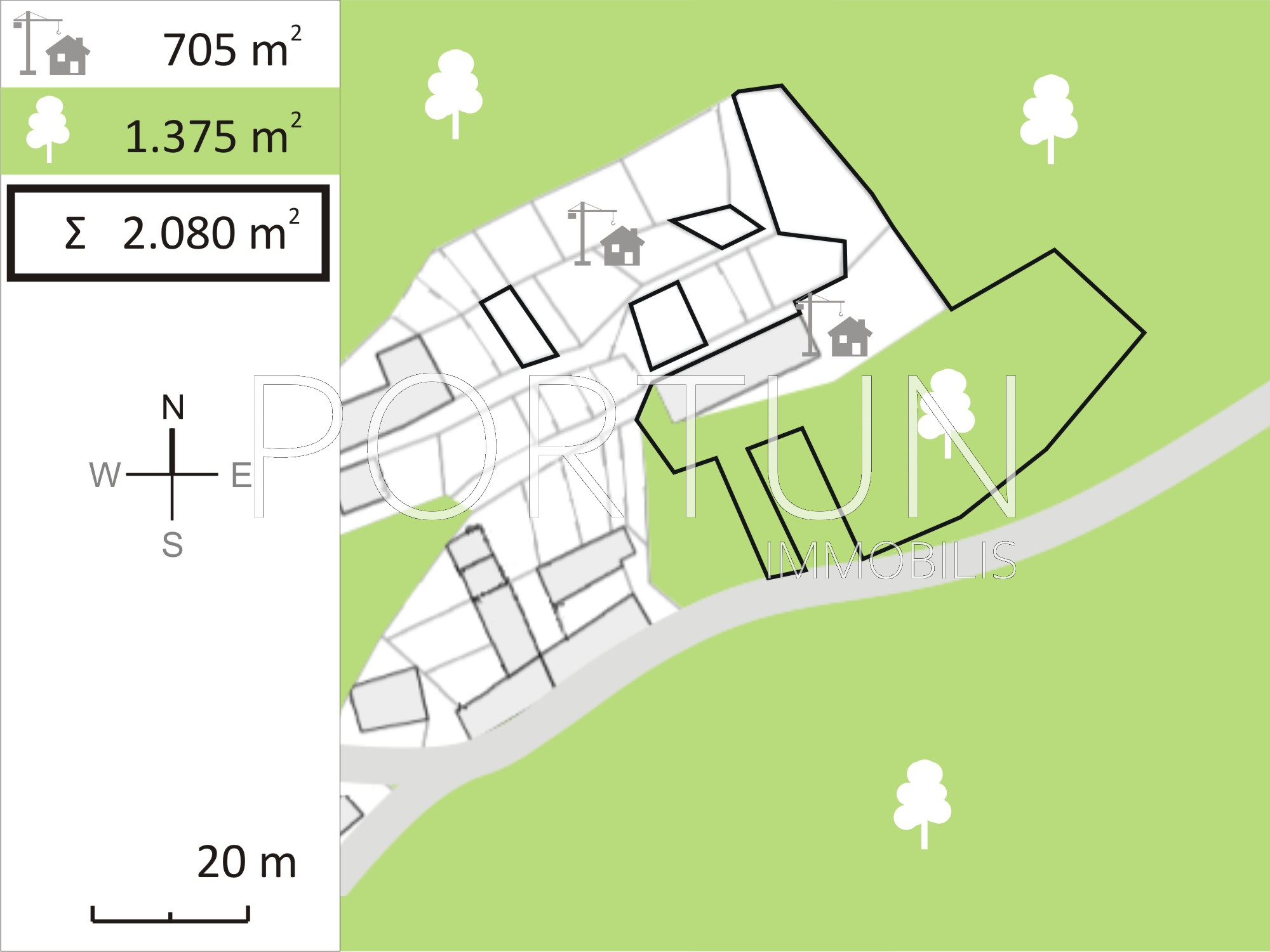 Imanje se sastoji od kuće koja se nalazi na građevinskom zemljištu (cca. 705 m2) te od zemljišta koje se nalazi izvan građevinskog područja (cca 1.375 m2). Kuća je smještena na gornjem, sjevernom dijelu zemljišta a južni dio zemljišta se spušta sve do nedavno asfaltirane prometnice. S obzirom da se kuća nalazi na relativno strmoj padini trajno je zajamčen pogled na okolne brežuljke i Motovun. Vanjske dimenzije kuće su cca 20 x 6 m. Kamena kuća koja vjerojatno datira u drugu polovicu devetnaestog stoljeća je strukturalno obnovljena početkom stoljeća godine, ali adaptacija nije stručno izvedena pa je uslijed jakih kiša popustilo krovište te je kuća danas polusrušena.