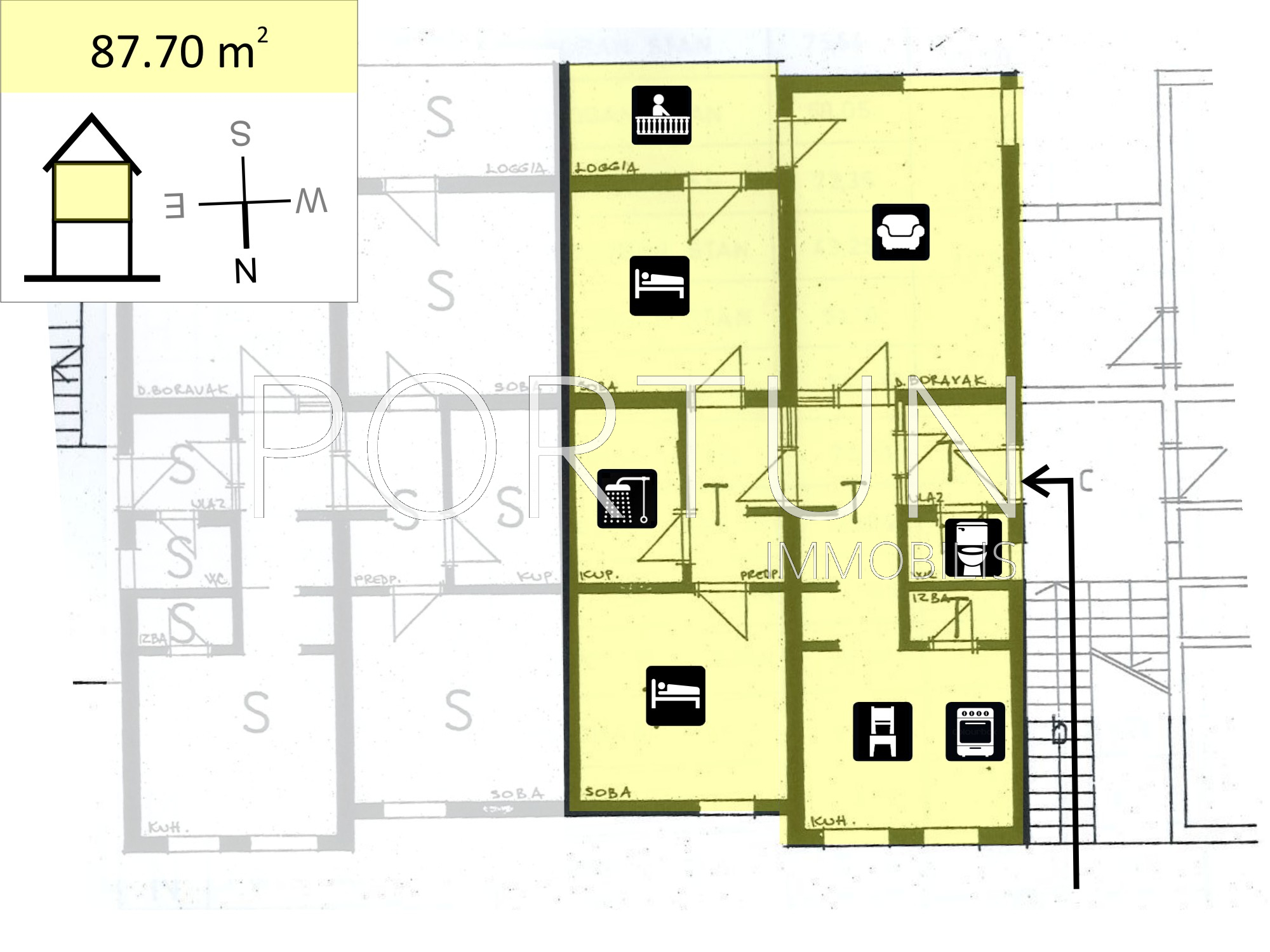 U stanu se nalaze dnevni boravak s blagovaonicom, kuhinja, dvije spavaće sobe, kupaonica, wc, loggia i ostava. Dnevni boravak s blagovaonicom i kuhinja gledaju na jugoistok. Spavaće sobe gledaju na sjeverozapad.